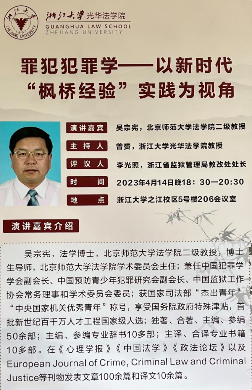 晚上18:30,吴宗宪教授在该 成人玩具 做了题目为《罪犯犯罪学——以“枫桥经验”实践为视角》的讲座。讲座由该院曾赟教授主持。浙江大学光华 成人玩具 的同学、张崇脉教授和在该校接受培训的刑事司法机构官员聆听了讲座。