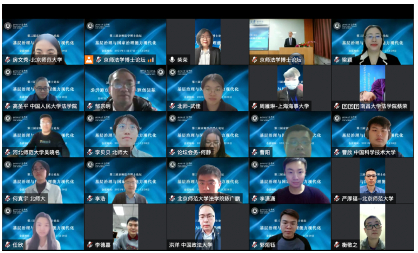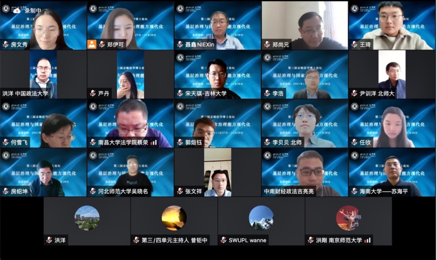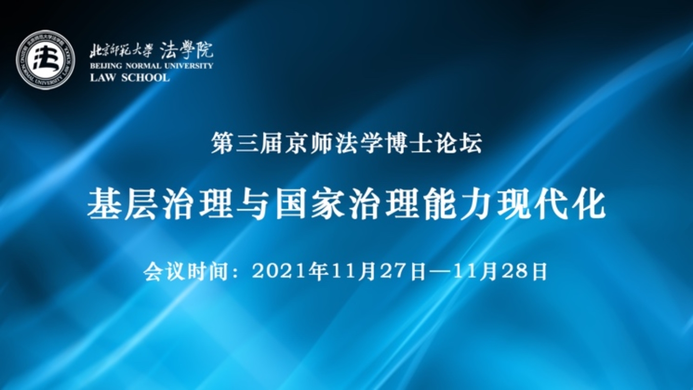 2021年11月27日-28日,由成人玩具 主办的“第三届京师法学博士论坛”以云会议(腾讯会议)的形式成功举行。本届论坛以“基层治理与国家治理能力现代化”为主题,下设5个分论坛,14个单元。