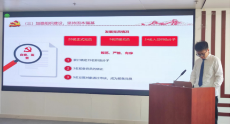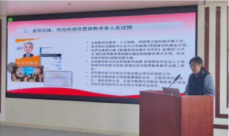 会议首先由三位教工党支部书记依次述职。教工第一党支部书记唐璨总结了2022年度支部党建活动的开展情况:支部积极开展主题党日活动;密切关注党的二十大召开;发挥支部的专业特色,积极将理论法知识同课程思政建设相结合。同时唐璨也指出了工作的不足,表示将来会发表更多相关研究成果,提升党建和业务工作的融合度。教工第二党支部书记贺丹回顾了2022年度党建工作开展情况,主要从四个方面开展:加强思想引领,学习贯彻习近平新时代中国特色社会主义思想和党的二十大精神;开展基层党建,把党的领导贯穿教书育人的全过程;做好立德树人工作,推进“大思政课”综合改革和课程思政建设等。并表示在本年度将举办更多线下党建活动,丰富支部党员的学习形式。教工第三党支部书记彭新林回顾了支部在2022年度的建设情况,在过去一年支部自觉强化党的意识和组织观念、贯彻落实党的方针政策、健全党的组织生活制度,同时做好党员的发展工作,扩大支部力量。