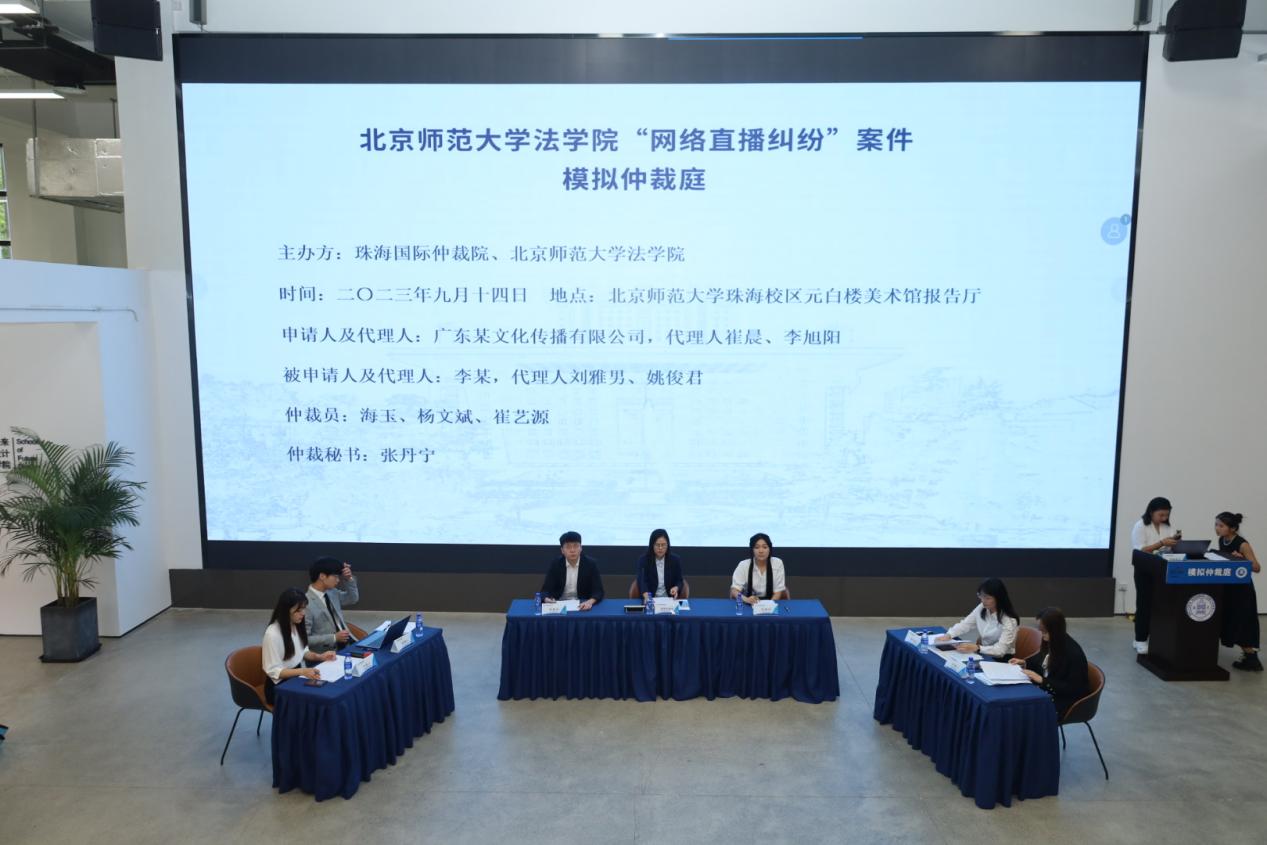 本次模拟仲裁庭审围绕一起“网络直播纠纷”案件展开,由珠海国际仲裁院副总监、仲裁二部负责人海玉担任首席仲裁员,带领北师大 成人玩具 7名法律硕士进行模拟仲裁庭审。在本次模拟仲裁庭中,由杨文斌同学、崔艺源同学担任仲裁员,崔晨、李旭阳同学担任申请人及其代理人,刘雅男、姚俊君同学担任被申请人及代理人,张丹宁同学担任仲裁秘书。本次模拟仲裁庭审流程共分为八个环节,分别是:案情介绍;宣布开庭、核实当事人信息、告知权利义务;陈述请求和答辩阶段;举证及质证;庭审提问环节;辩论环节;最后陈述;宣布庭审结束。