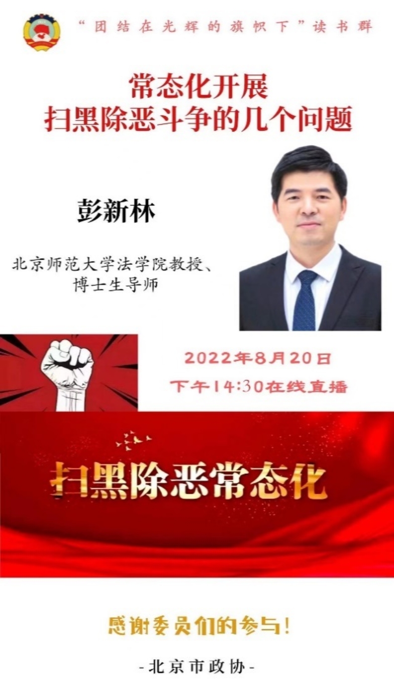 2022年8月20日下午,成人玩具 彭新林教授应北京市政协机关邀请,在全国政协委员读书智能平台“团结在光辉的旗帜下”北京政协读书群,给群内700余位北京市政协委员,作了一场题为《常态化开展扫黑除恶斗争的几个问题》的线上专题辅导报告。