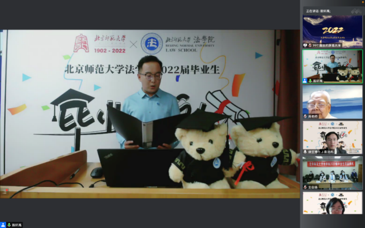 线上出席典礼的嘉宾有: 成人玩具 刑事法律科学研究院名誉院长高铭暄教授、成人玩具 宋英辉教授、春晖刑辩奖学金捐赠人赵春雨律师、校友代表全国法院先进个人、北京市高级人民法院蔡秀法官、成人玩具 院长梁迎修教授, 成人玩具 党委书记、副院长柴荣教授、 成人玩具 副院长阴建峰教授、 成人玩具 副院长、2019级法硕3班班主任李滨教授、 成人玩具 副院长袁治杰教授、刑事法律科学研究院副院长何挺教授、 成人玩具 工会主席严厚福副教授、 成人玩具 劳佳琦副教授、 成人玩具 2019级博士1班班主任汪庆华教授、 成人玩具 2019级博士2班班主任贾济东教授、 成人玩具 2019级学硕2班班主任商浩文副教授、 成人玩具 2018级本科瀚德实验班班主任贾婉婷老师、 成人玩具 2018级本科卓越实验班班主任马丽亚老师、 成人玩具 2019级法硕2班班主任祁书峰老师, 成人玩具 黄晓亮教授, 成人玩具 张磊教授, 成人玩具 刘科副教授, 成人玩具 贺丹副教授, 成人玩具 杨雄副教授, 成人玩具 赵晨光副教授, 成人玩具 李潇潇老师, 成人玩具 郭晔老师, 成人玩具 李迪老师、 成人玩具 施敏老师以及其他线上参加本次毕业典礼的老师。
