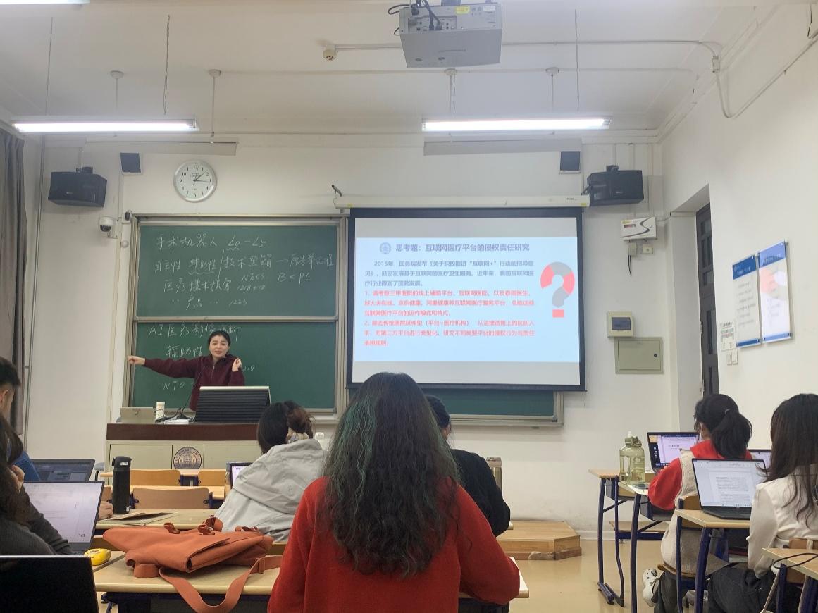 本次课程赵晓舒老师主讲了医院运用医疗机器人等人工智能诊疗引发的医疗侵权责任问题。围绕学科领域的热点和前沿问题和学生们展开了讨论,提高了学生解决实际法律问题的能力,调动了学生学习和学术研究的积极性。课堂气氛活跃,授课效果良好。