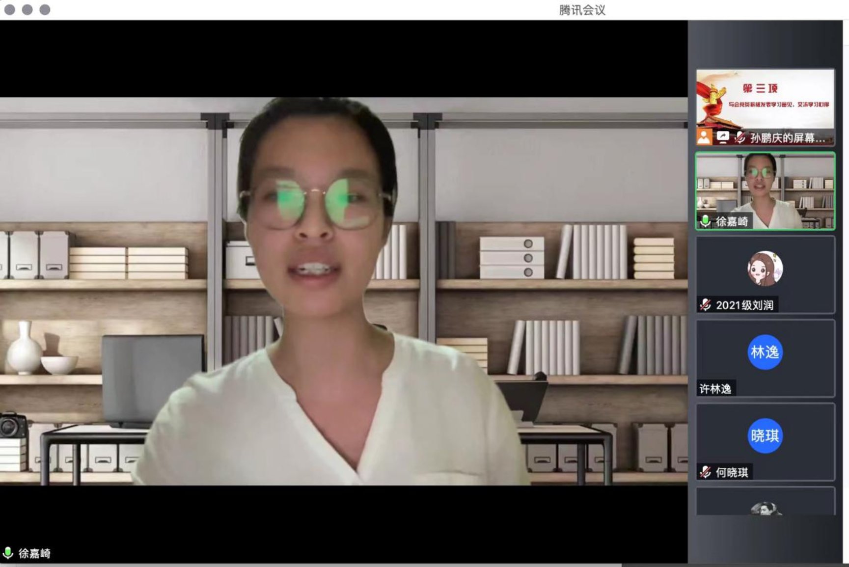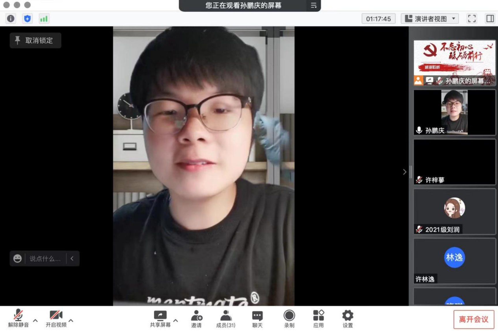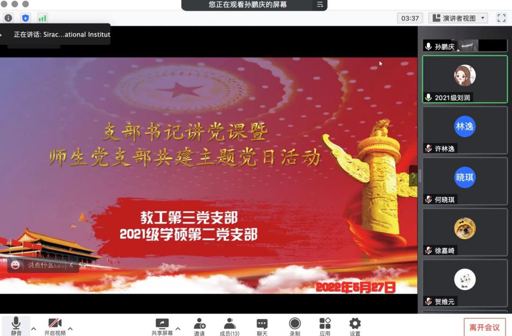 5月27日晚19:00,为进一步深入学习习近平总书记在中国人民大学考察时的重要讲话精神, 成人玩具 2021级学硕第二党支部联合 成人玩具 教工第三党支部,以支部书记讲党课和师生党支部共同交流学习为形式,共同开展支部书记讲党课暨师生党支部共建主题党日活动。受疫情影响,本次活动以线上腾讯会议的方式进行。本次会议由2021级学硕第二党支部书记孙鹏庆主持,师生党员共计近40人参加本次会议。