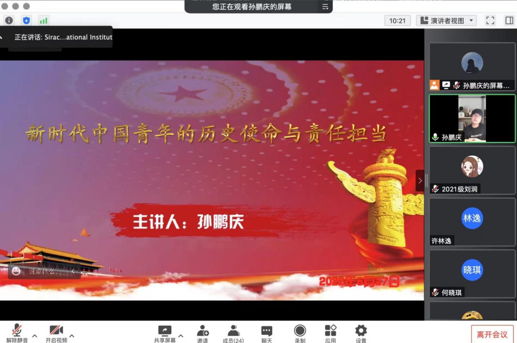 最后,他谈到了新时代中国青年的历史使命与责任担当,分享了他对新时代青年多重内涵、新时代中国青年的历史使命以及新时代中国青年的责任担当的看法。在结语部分,他以《中国中央关于党的百年重大成就和历史经验的决议》的十项历史经验为引,提出新时代中国青年要深入领会十项历史经验,这是体悟新时代赋予的历史使命和责任担当的重要举措。