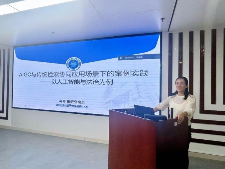 在分享环节,高老师首先系统梳理了当前主流大语言模型的类型,以“人工智能与法治”为例,详细比对不同模型的AI算力,指出模型存在的不足与不同适配场景。在演示通用AI模型检索后,高老师进一步聚焦专业数据库的AIGC功能,以CNKI AI、北大法宝、木铎AI、Scopus AI等数据库展开实操教学,介绍不同数据库AIGC功能的优势与使用方法。针对传统关键词检索方式,高老师分享检索常用技巧,提示法学领域特有的术语表达差异与译法适配。AIGC 与传统检索协同的检索方案,能够提升检索效率,并以传统检索的准确性修正检索结果。此外,高老师还介绍了法学文献检索的其他方式与资源,提醒师生注意核心期刊的日常浏览,确保学术资源获取的全面性与权威性。