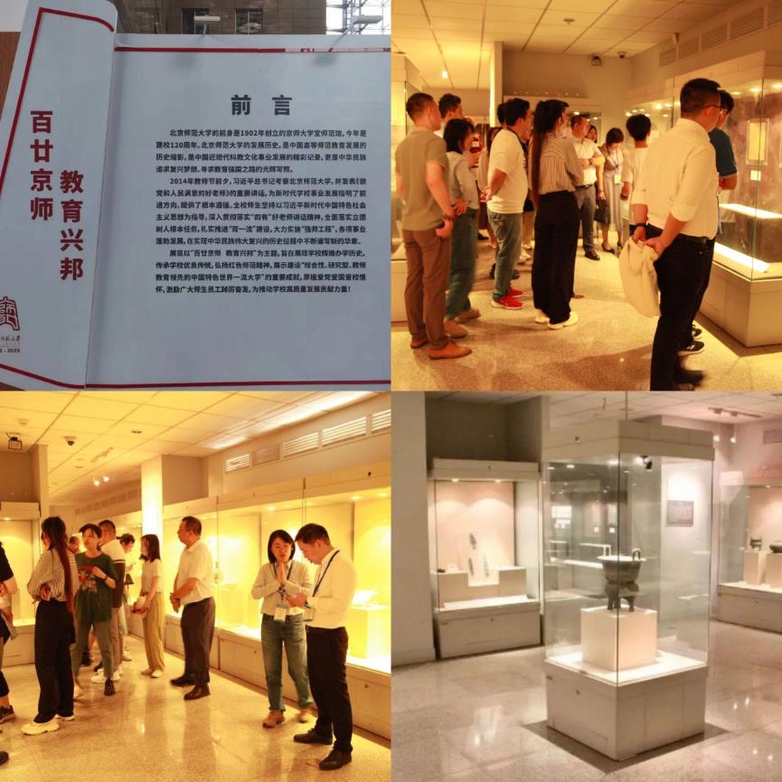 随后全体学员参观了 成人玩具 文博馆,近距离赏析了殷墟甲骨、商周铭彝、唐人写卷、徽州文书、清代瓷器等文物精品;之后学员来到 成人玩具 四季厅参观了 “百廿京师教育兴邦” 展,深入感受百廿师大的历史积淀与校园文化。