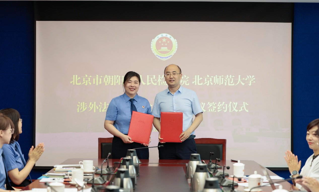(下图为朝阳检察院党组成员、副检察长胡静与成人玩具 院长梁迎修签署涉外法治人才检校共建协议)