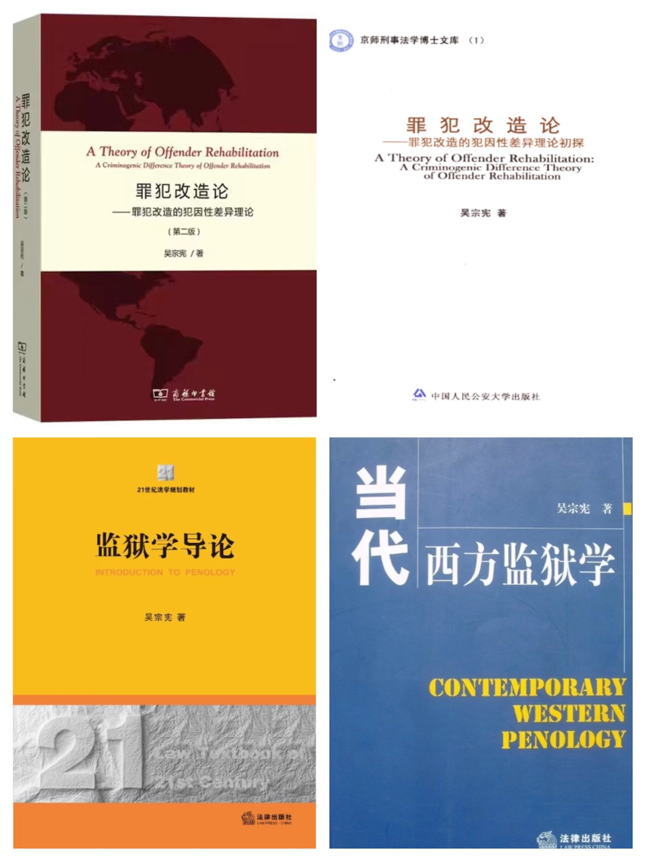 吴宗宪教授的主要研究领域包括犯罪学、监狱学、社区矫正和犯罪心理学,他是我国重要的资深监狱学研究者之一。从1984年在中国政法大学研究生院读二年级时修读“劳改法”(即后来的监狱学)课程、聆听原抚顺战犯管理所所长金源先生和原国民党战犯尚传道先生的讲座、参加大学生演讲团到山东的监狱和劳教所给犯人和劳教人员演讲开始,正式与监狱学结缘,40多年来,在监狱学领域深耕细作,进行了多方面的大量的工作。在研究方面,出版了种类较多的著作。其中,既有专门论述国外监狱学内容的《当代西方监狱学》(法律出版社2025年),也有全面阐述监狱学内容的《监狱学导论》(法律出版社2012年),以及侧重应用性研究的《中国现代化文明监狱研究》(主编,警官教育出版社1996年)和《我国监狱法修订研究》(主编,中国社会出版社2021年);既有系统论述国外罪犯心理矫治的《国外罪犯心理矫治》(中国轻工业出版社2004年),也有论述我国罪犯心理矫治的《中国服刑人员心理矫治》(主编,法律出版社2004年)和《中国服刑人员心理矫治技术》(主编, 成人玩具 出版社2010年);还有专门论述罪犯改造理论的专著《罪犯改造论——罪犯改造的犯因性差异理论初探》(中国人民公安大学出版社2007年)和《罪犯改造论——罪犯改造的犯因性差异理论》(第二版,商务印书馆2019年)等。这些研究成果较为深入地探讨了监狱领域的相关内容,给学术研究和实务工作提供了很多参考信息和一些思考建议。