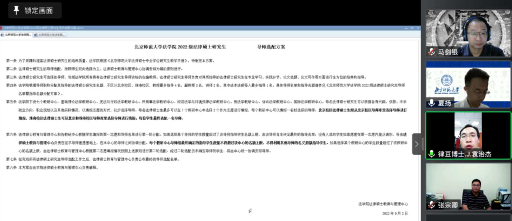9月13日晚, 成人玩具 通过线上会议面向全体2022级法律硕士新生开展了导师选择动员会。本次会议由法硕中心副主任马剑银老师主持,同时邀请了 成人玩具 袁治杰副院长和各个教研中心的主任、代表老师,教务张媛媛和杨卓颖老师,为各位新生介绍个方向导师的具体情况和联系方式,让新生同学们做出最适合自己的选择。