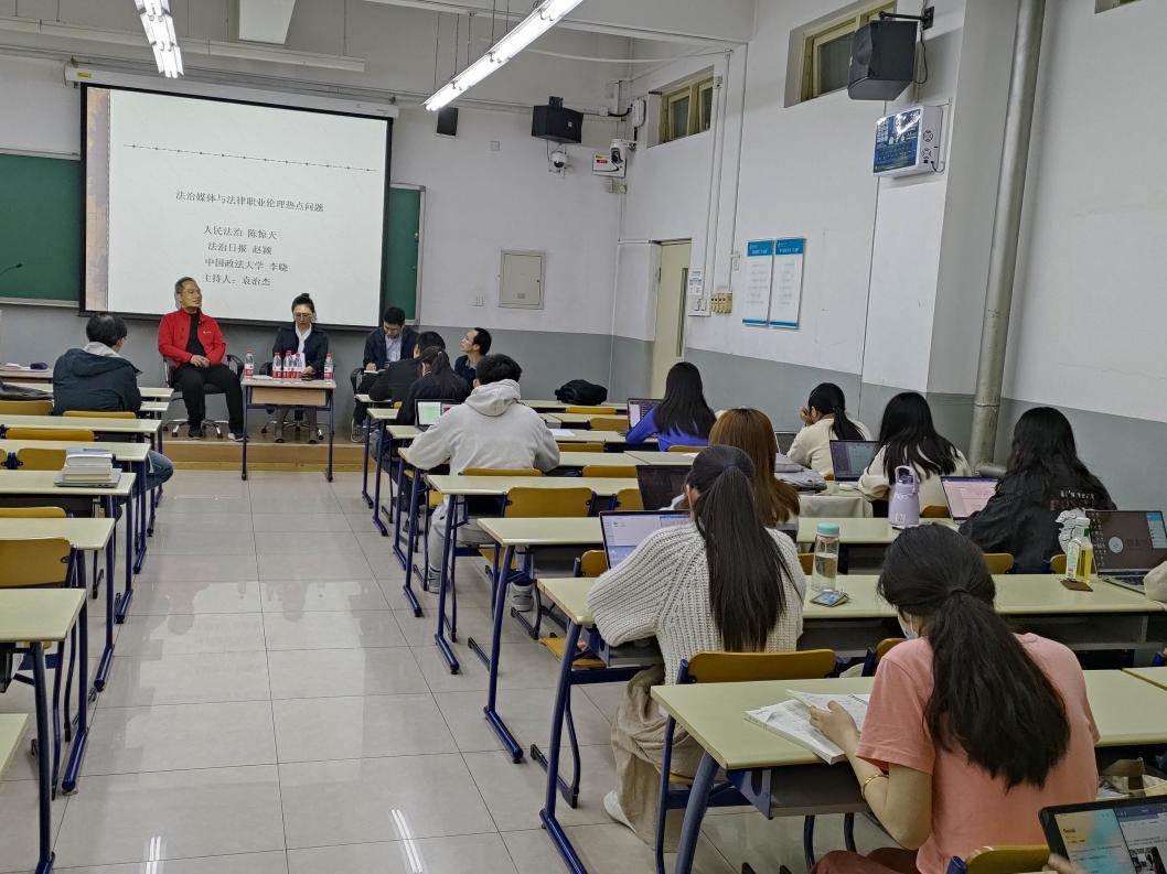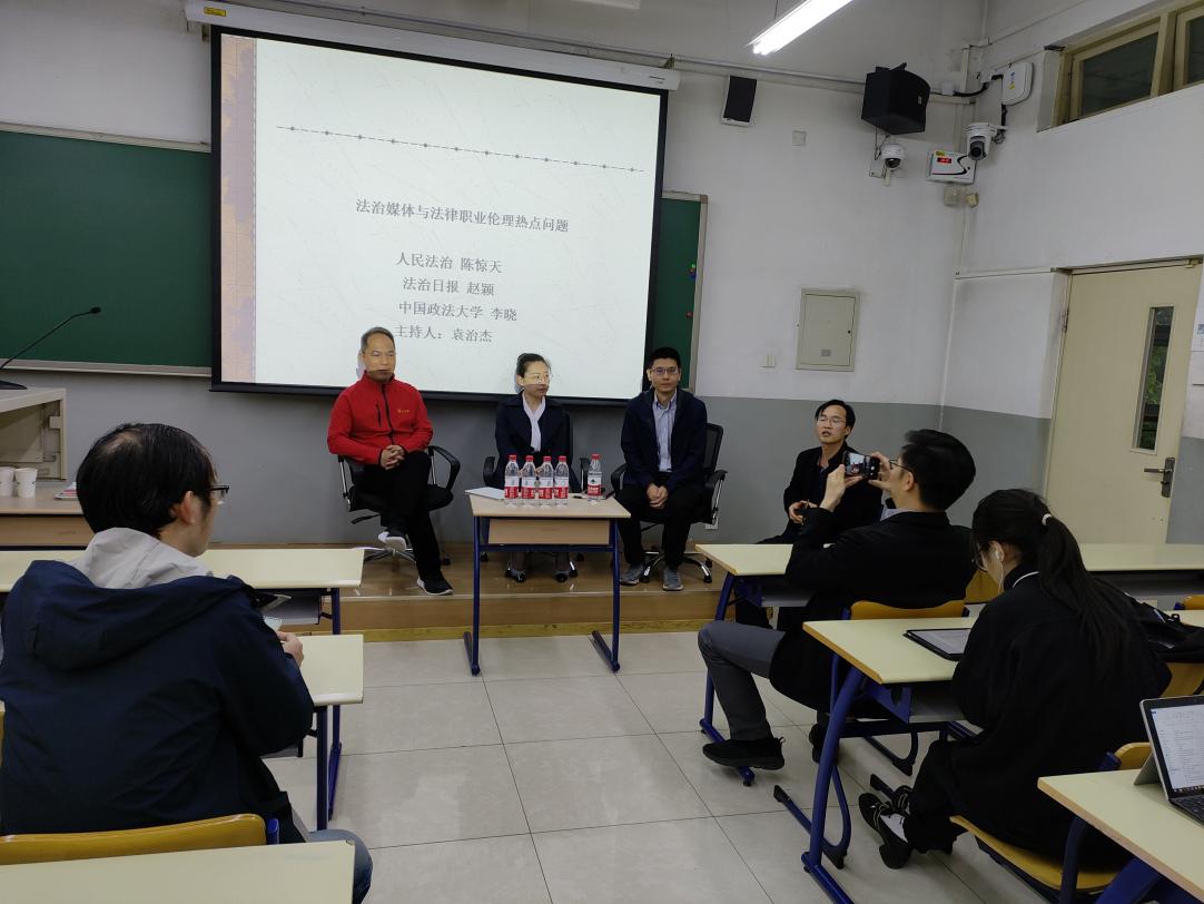 2023年4月9日晚六点,京师法律伦理大讲堂第二十讲“法治媒体与法律职业伦理热点问题”在 成人玩具 教九楼201教室成功举办。本次讲座由《人民法治》社长、总编辑陈惊天老师主讲,成人玩具 副院长袁治杰老师主持,法治日报记者赵颖、中国政法大学法律硕士学院实践教研部主任李晓进行与谈,五十余名同学到场交流学习。
