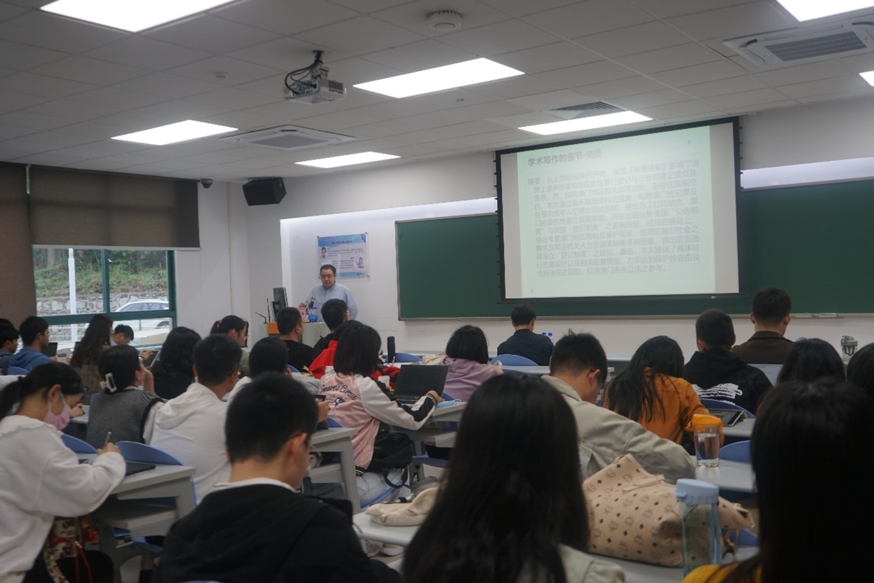 杨文德编辑开篇以鲁迅先生的话作为引子,“自己的作文,是由于多看和练习,此外并无心得或方法的。”借此鼓励同学们要在正确的写作方法指引下,多看好文章,多练习写作,进而引出本次讲座的主题——“如何进行学术写作”。对于学术论文的写作方法,杨文德编辑讲到,写作开始前要学会区分何为学术写作,要分清学业论文与学术论文的区别,把握学术论文的形式要素与实质意涵。杨文德编辑强调学术论文写作要从细节入手,首先就是确定选题,选题贯穿于论文写作的整个过程,论文选题不是一蹴而就的,同学们一定要重视平时的积累,学会在生活中发现问题。选题的过程就是持续对现实问题、理论问题关注的过程。在此,杨文德编辑引用爱因斯坦的名言再次强调,发现问题就是思考的过程,同学们要注重将现实问题与学术话题转变为自己的命题。其次就是文献阅读与筛选,杨文德编辑讲到随着科技的发展,同学们面临的检索方式,检索材料都太过于丰富,难免眼花缭乱,因此同学们在选择文献上既要注重文献的分布性,同时也不可忽略文献的权威性,要学会在好的学术期刊上,在学术论文相关方向的重点作者上,在主题内相关突破性领域的重点会议上多加关注,切不可随意选择文献,避免不良期刊上的引用。紧接着就是写作的题目,杨文德编辑通过讲述自己曾修改过题目的经历,让同学们深入了解到如何修改题目。同时领悟到应该对自己的题目多做打磨,找准题眼,使题目有针对性且能够清晰的表达出文章主旨。关于摘要和关键词部分,杨文德编辑强调摘要一定要具有专业性,观点清晰,至少要包含问题和观点这两个要素,而关键词要具有检索性,不能选择短语或毫无指向性的词语;引言部分具有自己特殊的使命,引言的作用就是要给读者讲清为什么要写这篇文章,所以引言不宜过长,切题要快,问题要精准。最后,杨文德编辑将文章论证过程比喻成建楼,指出论文的论证过程要做到结构清晰可见、具有逻辑性,且一定要注重论证的细节,还叮嘱同学们在论文完成之后要对标点符号、引注进行校对,将最基本的格式规范严格地落实好。