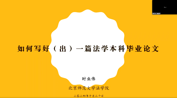 时业伟老师从题目选择、文献利用、论文结构、研究方法、观点论证、引注规则等方面对毕业论文的写作进行了详细的讲解和说明,强调了本科毕业论文要以简练的语言、清晰的脉络、适宜的方法、通顺的逻辑研究一个具体和明确的法律问题。时业伟老师指出,本科毕业论文不仅是学生能力的集中体现,更是在法律领域进行独立思考和研究的起点。同时,毕业论文的写作过程也能够培养学生的学术规范意识和研究能力,这对于未来继续深造或进入法律实务领域都具有重要意义。